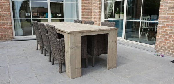 Eettafel van steigerhout met 4 haakse hoekpoten van ca. 20 x 20 cm.